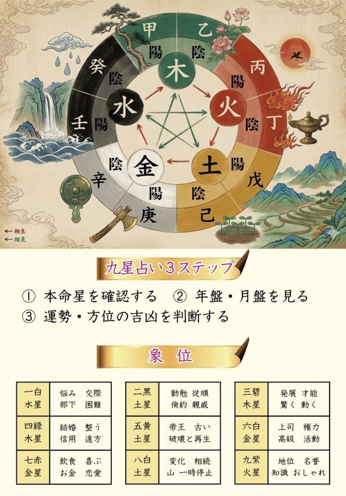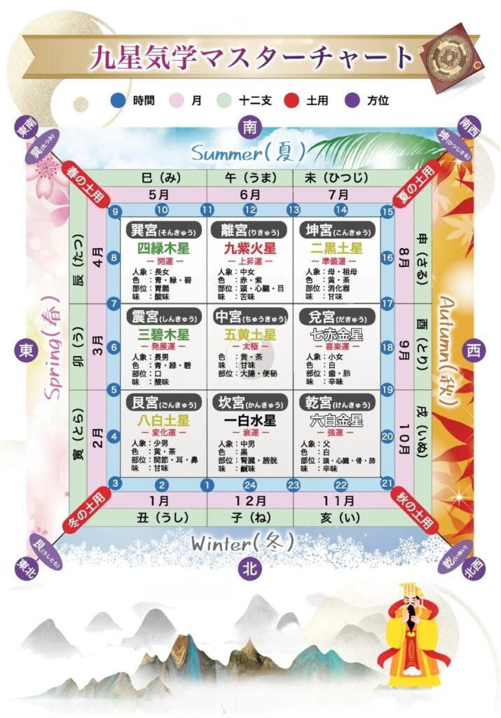 このチャートは、複雑な気学の要素を一枚に凝縮した、まさに「動く辞書」のような存在です。